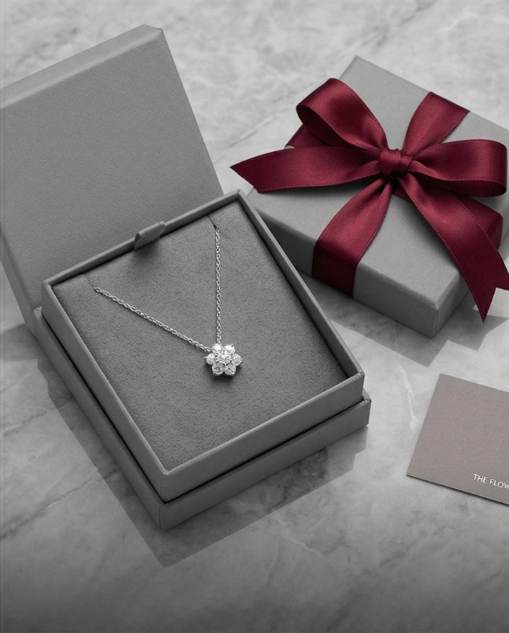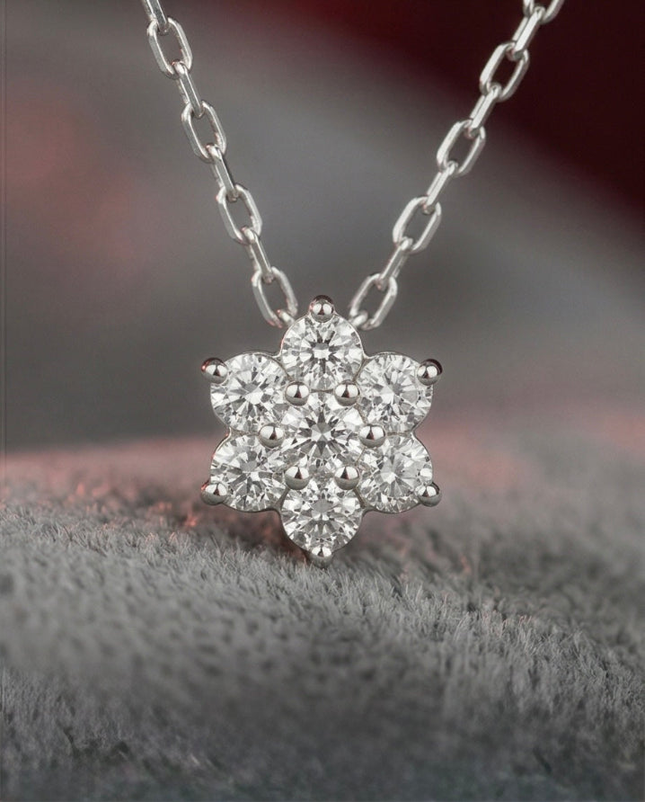 Small in scale, massive in fire. This artisan-crafted pendant reimagines the classic blossom with a "shared-prong" setting that minimizes metal and maximizes the natural sparkle of each lab-grown diamond.